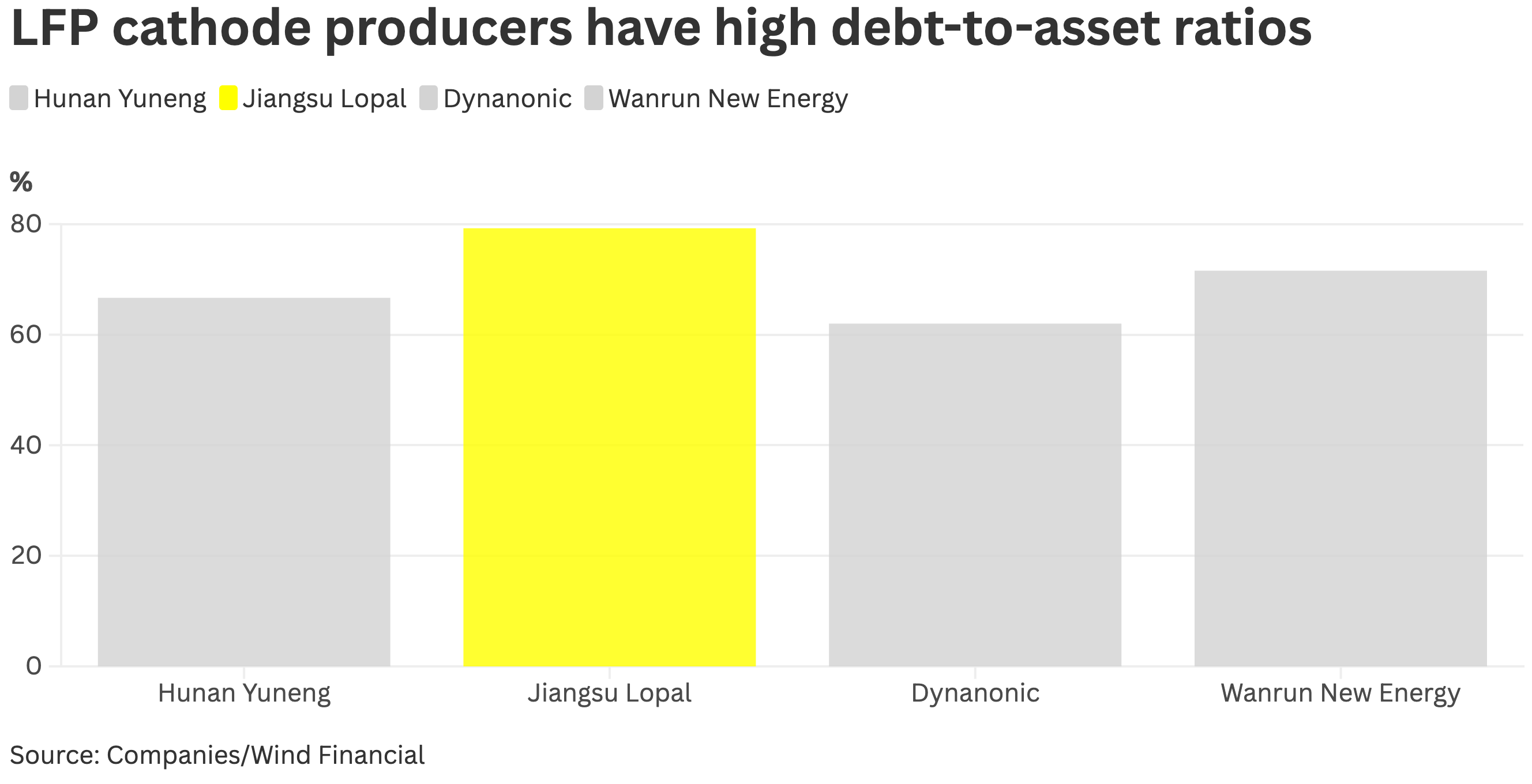 Because profit margins have been compressed to near zero, or turned negative, by years of overcapacity, many of these companies are no longer generating enough cash to meaningfully pay down their debts. Instead, they are forced to rely on a constant cycle of new borrowing or equity fundraising simply to keep operating and service their existing liabilities. Jiangsu Lopal, the world’s fourth-largest LFP cathode producer, now has a gearing ratio — total debt divided by equity — of 363%.