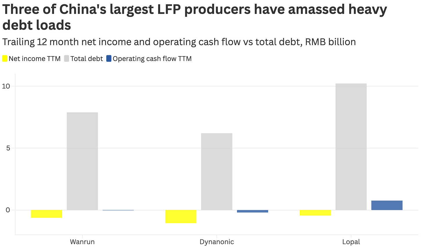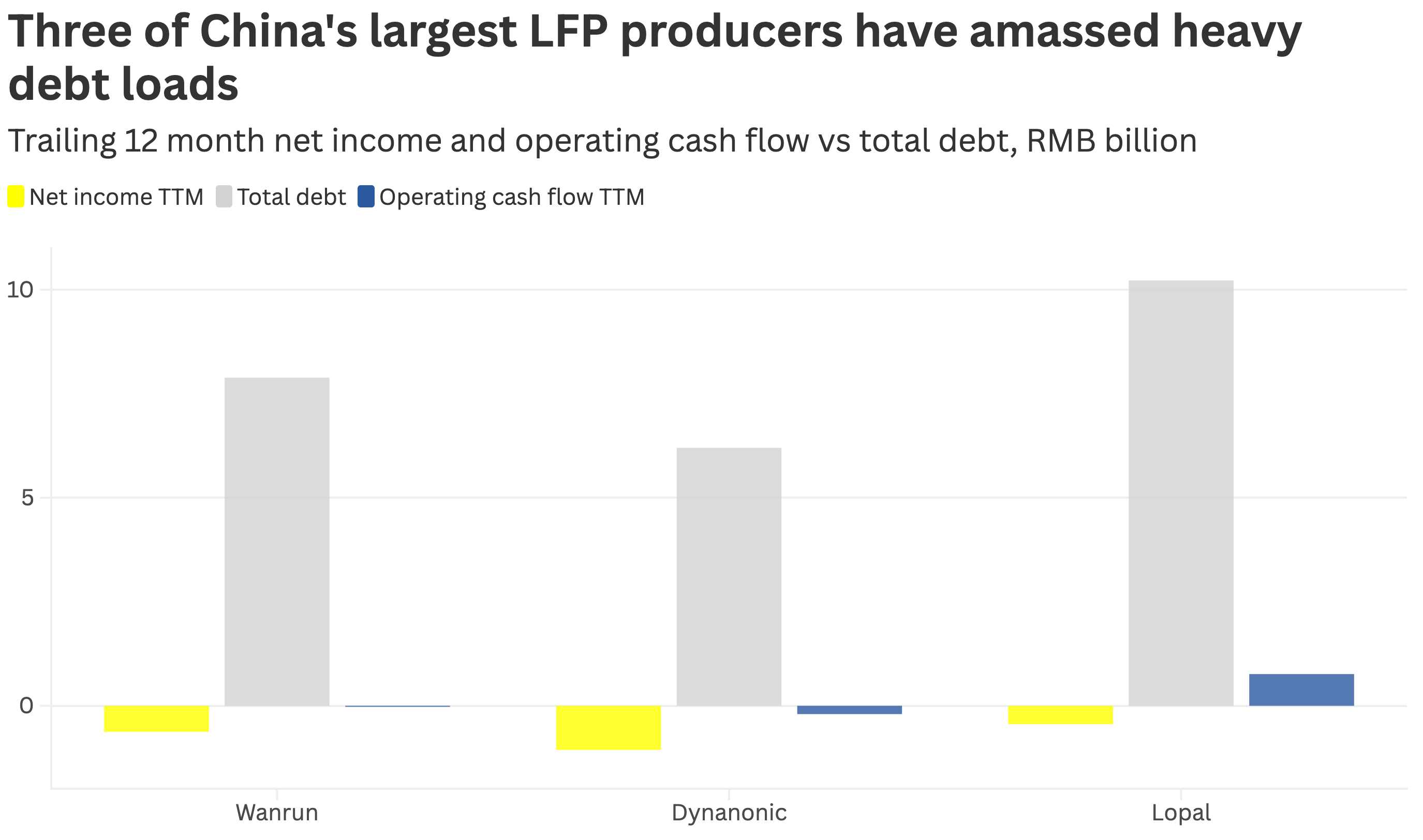 Despite their dominant position in global LFP cathode supply, China’s largest producers generate little operating cash relative to their debt loads, leaving them reliant on refinancing rather than repayment.